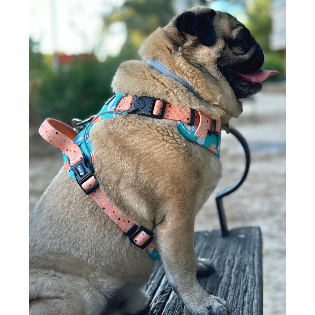 - 3 locking buckles, including a safety locking buckle at the neck, to prevent the harness from going over the head